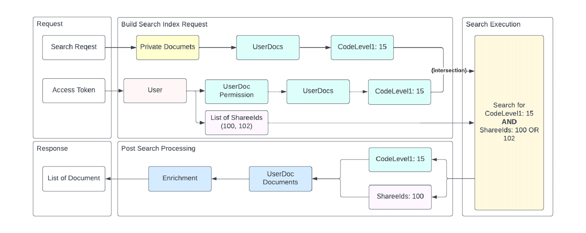 For UserDoc documents, on top of Basic entitlement model based on Document permissions, the system checks for shareeIds property when Search sub-system executes search request. There are no additional checks during post search processing. ↗ However, the Document Viewer in the platform double checks entitlements with our entitlement system.